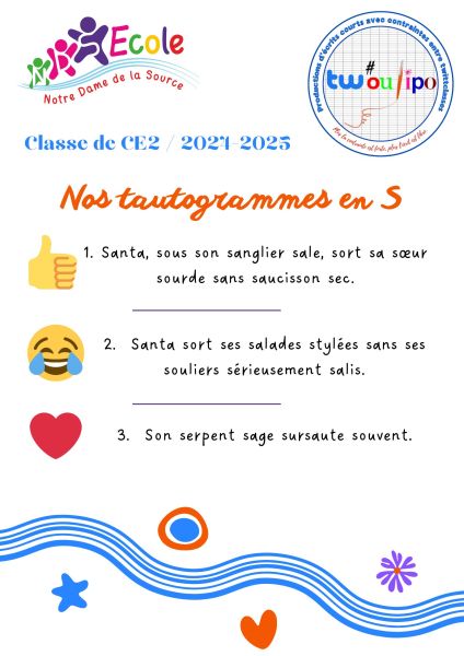 * un tautogramme en S : tous les mots de la phrase devaient commencer par la lettre S
