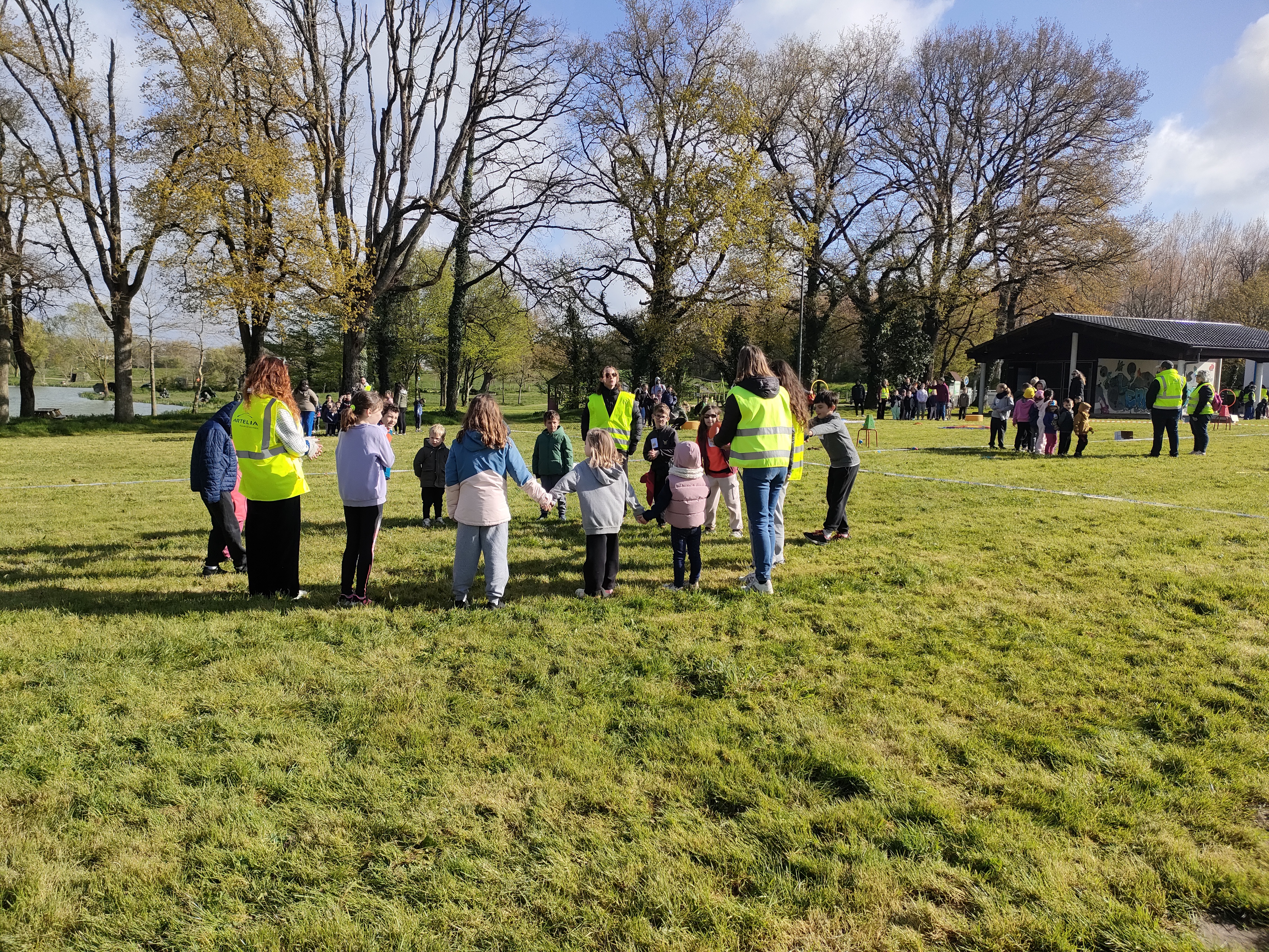 Direction ensuite le parc de loisirs pour deux heures et demie d’activités sportives organisées en trois circuits. Les élèves, répartis en 24 équipes mêlant les âges, ont enchaîné relais déguisés, jeux de lancer, défis de ballons chronométrés et constructions coopératives… Encadrés par 12 enseignants, soutenus par les personnels, AESH et de nombreux parents accompagnateurs, les enfants ont développé esprit d’équipe, respect et goût de l’effort dans une ambiance ludique.