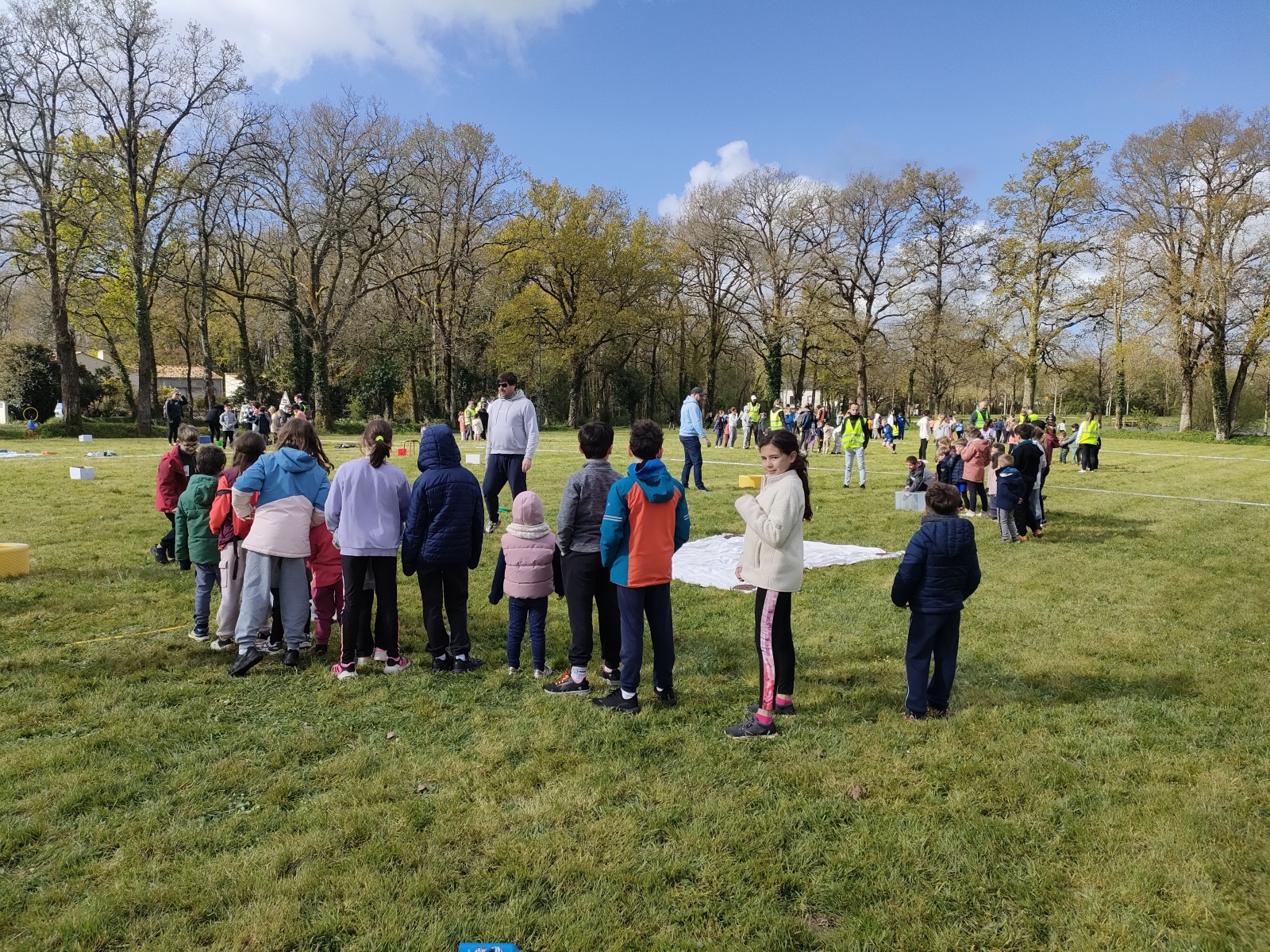 Direction ensuite le parc de loisirs pour deux heures et demie d’activités sportives organisées en trois circuits. Les élèves, répartis en 24 équipes mêlant les âges, ont enchaîné relais déguisés, jeux de lancer, défis de ballons chronométrés et constructions coopératives… Encadrés par 12 enseignants, soutenus par les personnels, AESH et de nombreux parents accompagnateurs, les enfants ont développé esprit d’équipe, respect et goût de l’effort dans une ambiance ludique.