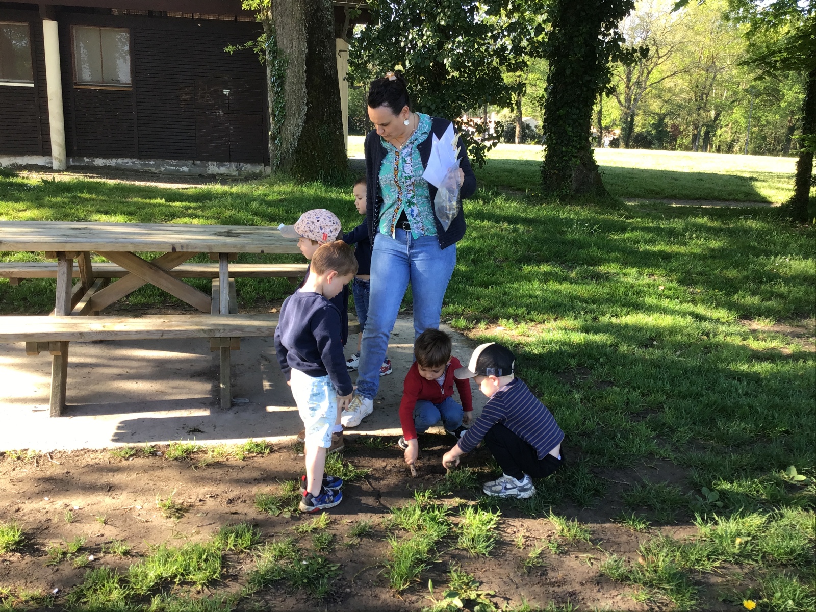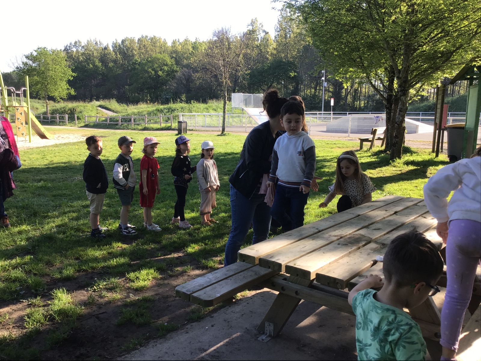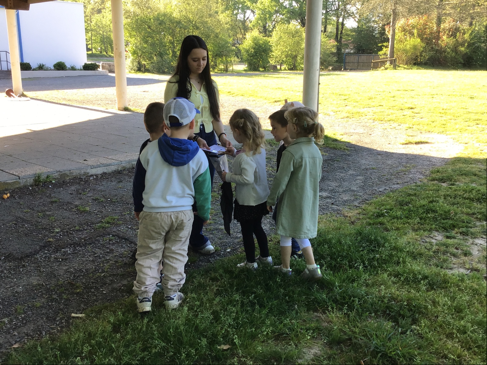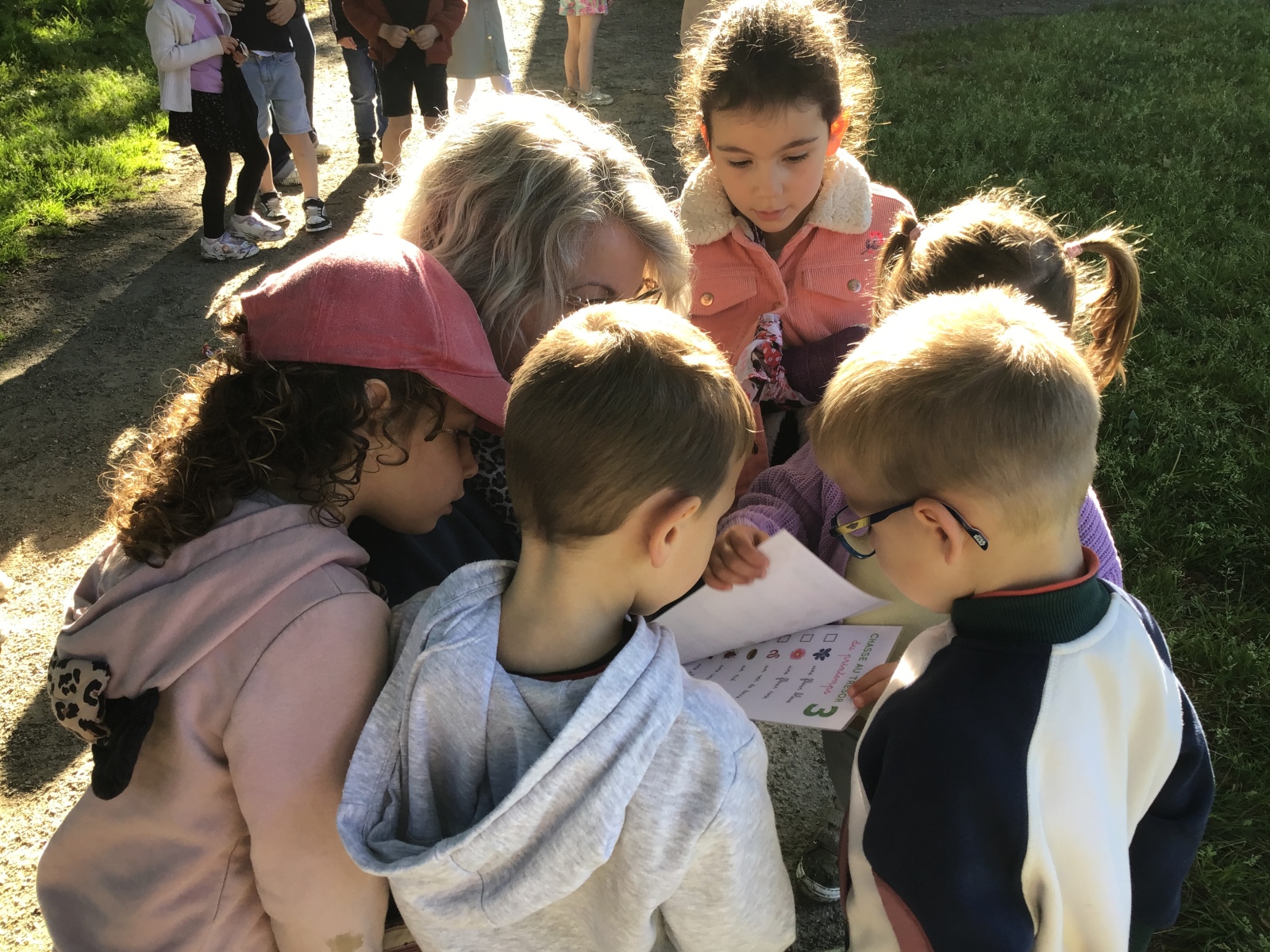 Au programme, une chasse au trésors d’éléments de la nature (chaque équipe est partie à la recherche d’un ver de terre, d’une fleur blanche, d’un insecte qui vole, d’une fourmi…), un parcours sportif, une écoute d’une histoire (la promenade du petit hérisson) et un jeu de kim, l’occasion d’apprendre à nommer et reconnaître la pâquerette et le pissenlit.