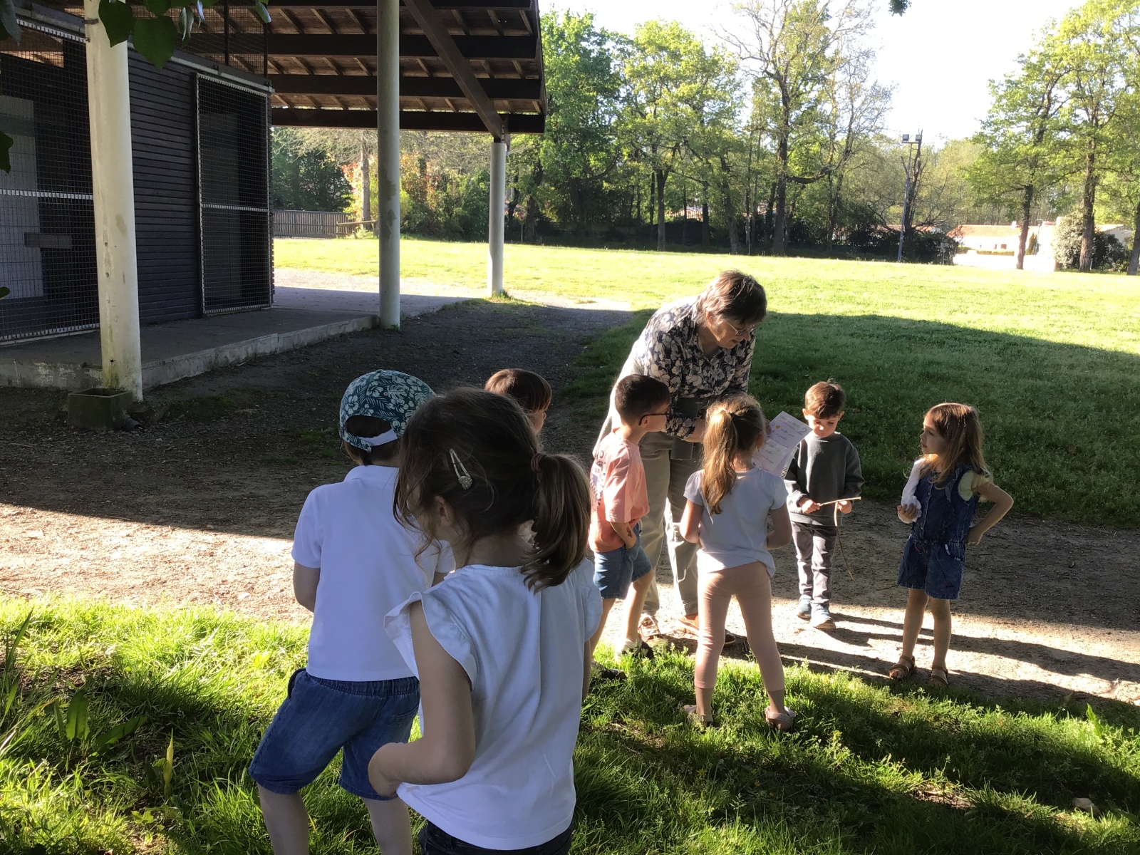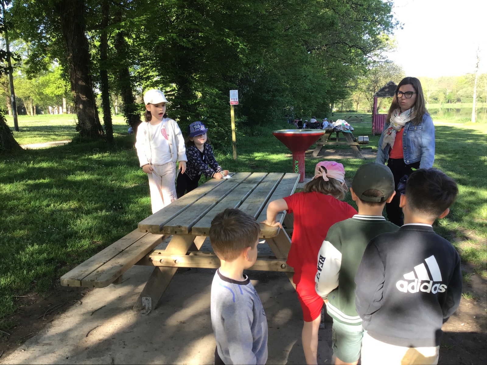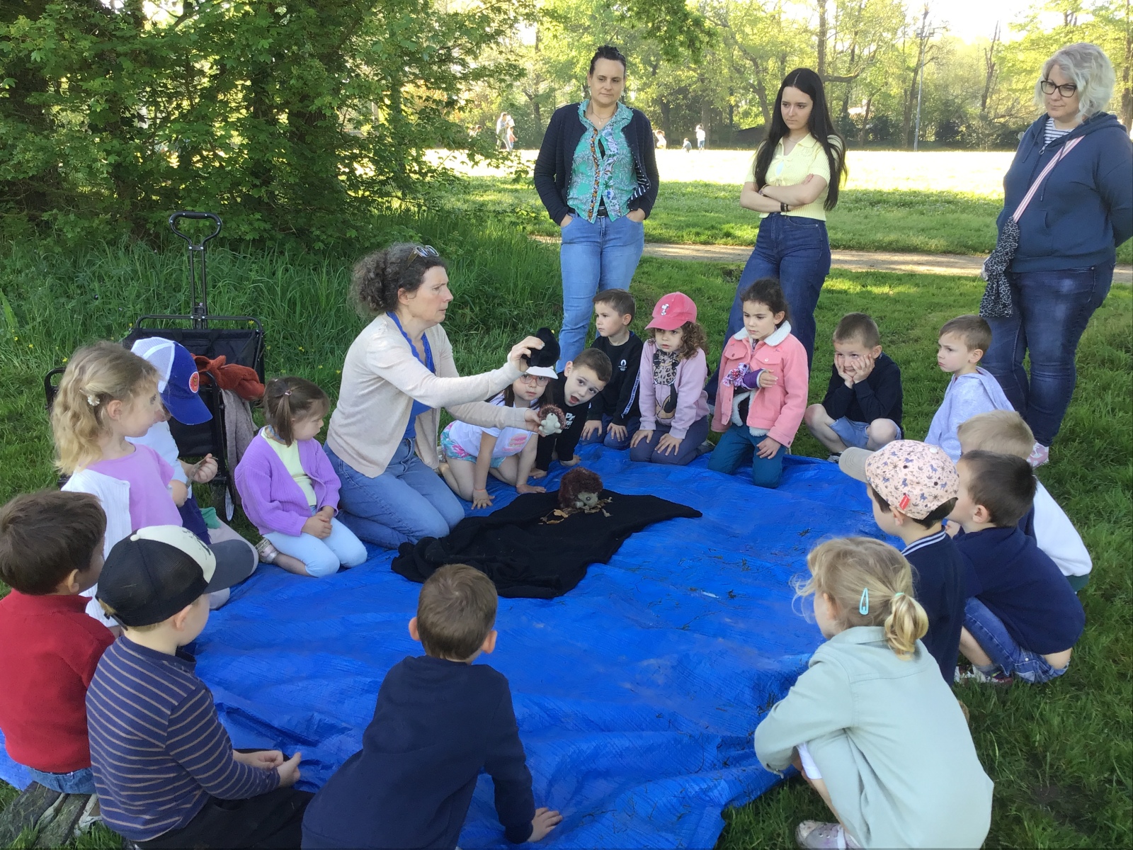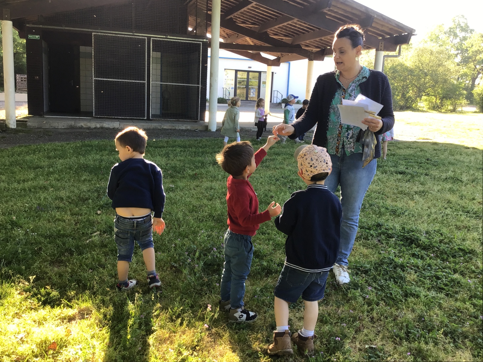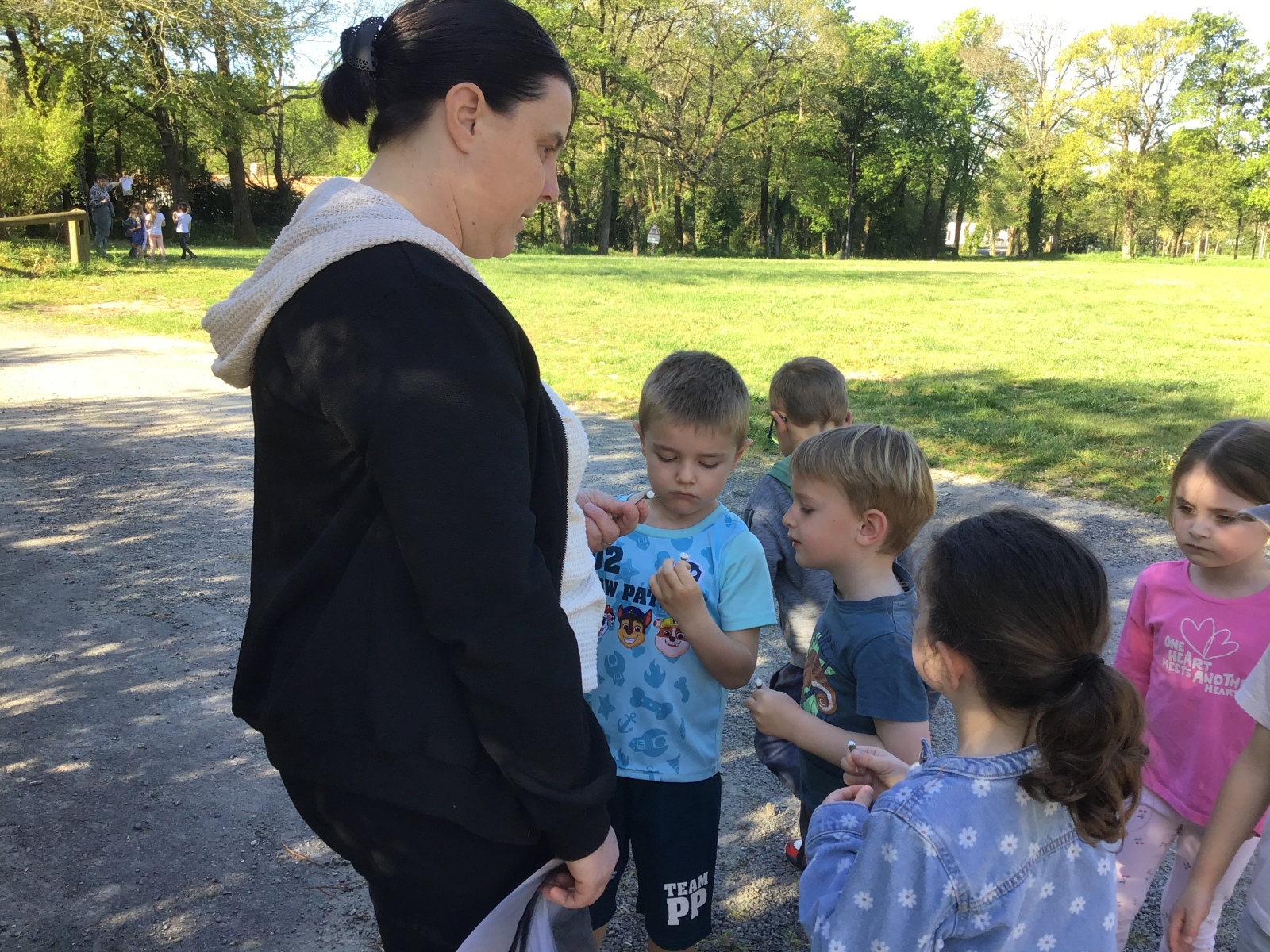 Au programme, une chasse au trésors d’éléments de la nature (chaque équipe est partie à la recherche d’un ver de terre, d’une fleur blanche, d’un insecte qui vole, d’une fourmi…), un parcours sportif, une écoute d’une histoire (la promenade du petit hérisson) et un jeu de kim, l’occasion d’apprendre à nommer et reconnaître la pâquerette et le pissenlit.